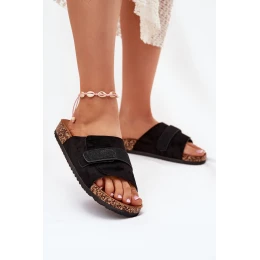 Klapki Damskie Z Rzepem Na Korkowej Platformie Czarne Baylin