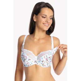 Podprsenka Kaia je modelom pre dojčiace mamičky. Horný košíček je vyrobený z krásnej bielej elastickej čipky. Spodný košíček (vystužená časť) a časť horného košíčka s klipom sú vyrobené z potlačeného úpletu so vzorom kvetín a vtáčikov. Zadná strana je vyrobená zo silného potlačeného úpletu.
