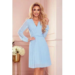 Plisované šifónové šaty s výstrihom a dlhými rukávmi. Šaty v modrej farbe. Značka Numoco. Poľská produkcia.