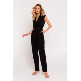 Informácie o výrobku: tkaná textília jednodielny overal s asymetrickým vzorom vrchný diel bez rukávov s golierom a hlbokým výstrihom do V zúžené nohavice zapínanie na patentku a skrytý zips vpredu čiastočne elastický pás bočné vrecká opasok so sponou Náš model je vysoký 171 cm a nosí veľkosť S navrhnutý a vyrobený v Poľsku