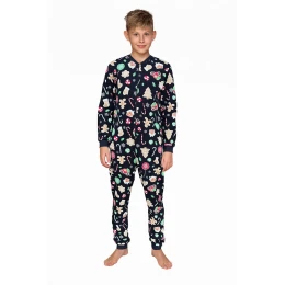 Chlapčenský overal z kvalitnej bavlny so slávnostným vzorom. Zapínanie na zips. Rukávy a nohavice zakončené rebrovanými manžetami. Praktické vrecká na úrovni bokov.