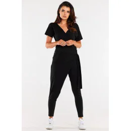 Kombinéza s úzkymi nohavicami, zavinovacím vrchným dielom, širokým elastickým pásom, asymetrickým zaväzovaním vpredu a vreckami. Navrhnuté a vyrobené v Poľsku.