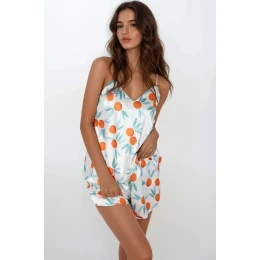 Saténový komplet s blúzkou na tenkých, nastaviteľných ramienkach, so šortkami, vďaka ktorým budú vaše stehná a boky vyzerať sexi... Môže byť niečo zmyselnejšie a pohodlnejšie? Satén zvýraznený krásnym, zaujímavým vzorom je skutočnou pastvou pre oči. Šortky na mäkkom elastickom páse. Dizajn, ktorý sa osvedčí bez ohľadu na ročné obdobie. Zloženie: 100% polyester.