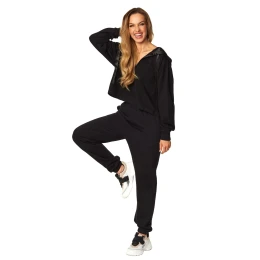 Skvelý dvojdielny komplet z kvalitnej bavlny, ktorý sa rýchlo stane vaším obľúbeným kúskom v šatníku. Mäkký a veľmi pohodlný, prepracovaný v každom detaile a neuveriteľne ženský. Vrchný diel je s dlhými rukávmi a kapucňou podšitou krásnym strieborným saténom. Výstrih do V zvodne odhalí váš pôvab. Dlhé nohavice s bočnými vreckami, nohavice zakončené elastickými nohavicami. Klasická čierna farba. Zloženie: 100 % kvalitná bavlna.