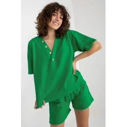 Mikinový set pozostávajúci z blúzky a šortiek. Blúzka s krátkymi rukávmi a výstrihom do V. Šortky so zaväzovaním v páse a vreckami.