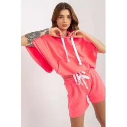 Mikinový set pozostávajúci z blúzky a šortiek. Blúzka s krátkymi širokými rukávmi, kapucňou a klokaním vreckom. Šortky so zaväzovaním v páse a vreckami.