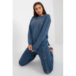 Dámska tepláková súprava pozostávajúca z mikiny a nohavíc. Voľná mikina s dlhými rukávmi a ozdobným nápisom na prednej strane. Dlhé nohavice s elastickým pásom a vreckami na bokoch.