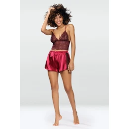 Fenomenálna súprava vo vínovej farbe, ktorá obsahuje nápadnú čipkovanú blúzku s tenkými, nastaviteľnými ramienkami a krásne saténové šortky s čipkovým lemom na boku. Súprava je ideálna ako pyžamo alebo ako domáce oblečenie. Blúzka má profilované košíčky a možno ju nosiť k bežnému oblečeniu. Šortky majú pohodlný, tvarovaný strih. Zloženie: 100 % polyester.