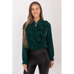 Táto elegantná dámska košeľa s klasickým strihom očarí výnimočným detailom širokého plisovaného džbánu umiestneného na prednej strane, ktorý jej dodáva štýlový a hosťujúci charakter. Je vyrobená z hladkého polyesteru, vyzerá bezchybne a je ideálna na každodenné nosenie, do práce alebo na slávnostné udalosti. Model štandardnej dĺžky má dlhé nadýchané rukávy, ktoré mu dodávajú jemnú ľahkosť a ženský šarm. Výstrih na zaväzovanie vytvára efektné zakončenie a klasické zapínanie na gombíky podčiarkuje nadčasový štýl košele. Je ideálnou voľbou pre ženy, ktoré ocenia eleganciu v modernom dizajne.