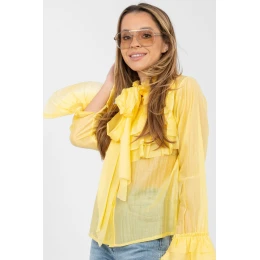 Elegantní dámská košile s límečkem, klasický model ideální na každý den, do práce a na slavnostní příležitosti. Vyrobena z vysoké kvality směsi tencelu a polyesteru, co zajišťuje měkkost, lehkost a pohodlí nošení, a zároveň elegantní, pečlivý vzhled. Model standardní délky se vyznačuje hladkým vzorem, který zdůrazňuje její nadčasový charakter. Dlouhé rukávy ukončené volánem dodávají celku jemnou ženskost a jemnost, a límec opticky prodlužuje siluetu a zdůrazňuje krk. Na přední straně košile je volán s mašlí, což představuje elegantní detail, dodávající eleganci a jedinečný charakter. Košile má také knoflíkové zapínání, což usnadňuje její přizpůsobení a zachovává klasický střih. Je to skvělý návrh pro ženy, které oceňují spojení elegance, pohodlí a jemných detailů v každodenních i slavnostních stylizacích.