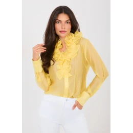 Dámská košile z průhledného materiálu je stylovým návrhem, který kombinuje klasiku s decentní elegancí. Vyrobená z lehkého, jemného materiálu z tencelu s přídavkem polyesteru se krásně skládá na postavě a dodává stylizaci lehkost a rafinovaný charakter. Klasický střih s standardní délkou byl doplněn dlouhým rukávem a výstřihem zakončeným stojáčkem, který zdůrazňuje elegantní styl košile. Zapínání na knoflíky zajistí pohodlí nošení a umožní přizpůsobit košili různým příležitostem. Výjimečným prvkem modelu je žabot, který přidává celku eleganci a ženskou jemnost, čímž košili činí ideální volbou jak na společenské události, do práce, tak i do elegantnějších každodenních stylizací. Hladký vzor zajišťuje, že se košile skvěle kombinuje s sakem, látkovými kalhotami nebo sukní, vytvářející nadčasové a stylové kombinace.