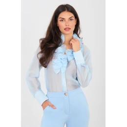 Dámská košile z průhledného materiálu je stylový návrh spojující klasiku s decentní elegancí. Vyrobená z lehkého, jemného materiálu z tencelu s přídavkem polyesteru, krásně padne na postavě a dodává stylizaci lehkost a rafinovaný charakter. Klasický střih s standardní délkou doplňuje dlouhý rukáv a výstřih zakončený stojáčkem, který zdůrazňuje elegantní styl košile. Zapínání na knoflíky zajišťuje pohodlnost nošení a umožňuje přizpůsobit košili různým příležitostem. Výjimečným prvkem modelu je krajka, která dodává celku eleganci a ženskou jemnost, čímž košili činí ideální volbou jak na společenské události, do práce, tak i do elegantnějších každodenních stylizací. Hladký vzor dělá košili skvěle sladitelnou s sako, materiálovými kalhotami nebo sukní, vytvářející nadčasové a stylové sestavy.