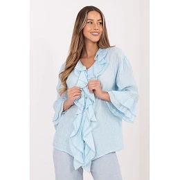 Dámská košile v boho stylu, která se perfektně hodí jak pro každodenní stylizace, tak do práce. Model se vyznačuje rozmanitou texturou materiálu, která dodává celku zajímavý a stylový charakter. Košile je vyrobena z lehké a příjemné na nošení tkaniny, která je kombinací viskózy a nylonu. Materiál je prodyšný, jemný na pokožce a dobře se drapí na postavě. Standardní délka umožňuje nosit košili jak zastrčenou do kalhot nebo sukně, tak volně. Model má výstřih do v a zapínání na knoflíky, a efektní límec ve formě volánku. Přední část košile zdobí dekorativní volán, který jí dodává romantický charakter. Dlouhé rukávy jsou zakončeny jemnými volánky, což podtrhuje lehkost a ženský boho styl. Je to výjimečný návrh pro ženy, které cení pohodlí spojené s originálním, módním designem.