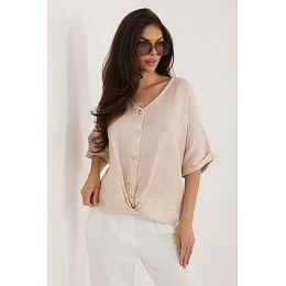 Dámska košeľa s ľahkým a pohodlným strihom, ideálna na každodenné nosenie. Je vyrobená z tkaniny jemnej na dotyk, ktorá kombinuje viskózu a nylon, vďaka čomu je materiál priedušný, ľahký a dobre prilieha k postave. Model sa vyznačuje pestrou štruktúrou materiálu, ktorá dodáva košeli zaujímavý a štýlový charakter. Košeľa nemá golier a výstrih v tvare srdca jemne zvýrazňuje dekolt a dodáva celkovému vzhľadu ženskú ľahkosť. Krátke rukávy znamenajú, že model je skvelý na teplé dni. Štandardná dĺžka umožňuje nosiť košeľu zastrčenú do nohavíc alebo sukní, prípadne voľne. Zapínanie na gombíky je praktické a uľahčuje obliekanie, pričom je aj klasickým zakončením.