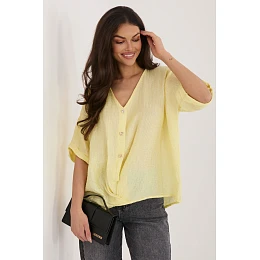 Dámska košeľa s ľahkým a pohodlným strihom, ktorá je ideálna na každodenné nosenie. Materiál je vyrobený z príjemnej tkaniny kombinujúcej viskózu a nylon, je priedušný, ľahký a dobre sedí na postave. Model sa vyznačuje pestrou štruktúrou materiálu, ktorá dodáva košeli zaujímavý a štýlový charakter. Košeľa nemá golier a výstrih v tvare srdiečka jemne zvýrazňuje dekolt a dodáva celku ženskú ľahkosť. Krátke rukávy zasa zabezpečujú, že model je ideálny na teplejšie dni. Štandardná dĺžka umožňuje nosiť košeľu buď zastrčenú do nohavíc alebo sukní, alebo voľne. Zapínanie na gombíky je praktické a uľahčuje obliekanie, pričom je klasickým zakončením.
