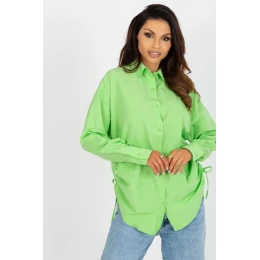 Dámska košeľa jednoduchého voľného strihu s dlhými rukávmi, zapínanie na gombíky. Zaväzovanie na bokoch.