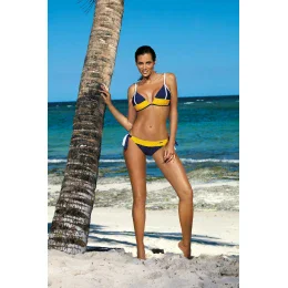 Módne dvojdielne plavky v bikinovom štýle s vystuženými košíčkami a pevnými (neodnímateľnými) push-up košíčkami. Košíčky sú dokonale tvarované, nadvihujú a opticky zväčšujú prsia a vytvárajú zvodný dekolt. Dve látky, hladká a mierne reliéfna, im dodávajú zaujímavý charakter a odlišujú ich od ostatných. V páse sa zapínajú na pracku, ramienka sa zaväzujú za krkom a spodný diel sa pohodlne zaväzuje na oboch stranách bokov - najlepšia časť. Celok pôsobí elegantne, žensky, sexi a moderne. A dokonale zdobí telo. Odporúčame!