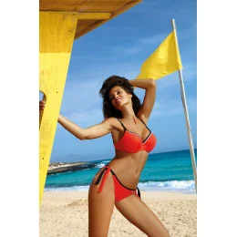 Podprsenka nádherně sbírá ňadra, nadzvedává je a jako vždy u výrobce je opticky zvětšuje. To vše díky dobře modelovaným vyztuženým košíčkům s nižší kosticí a push up, tentokrát zabudovaným napevno do modelu (push up je k dispozici ve velikostech S, M, L, XL). Hladká, sytá barva kostýmku skvěle vynikne na slunci a zvýrazní vaše opálení. Ramínka jsou jemná, tenká a délkově nastavitelná. Obvod se pohodlně zavazuje na zádech. Kalhotky jsou brazilského střihu, s dodatečným prošitím přes střed zad - sexy zdobí boky a opticky zaoblují zadeček. Aby bylo dosaženo zamýšleného efektu, měly by být pevně vytažené směrem nahoru k bokům.
