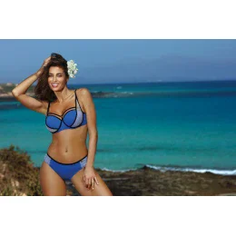 Plavky nádherně zdobí tělo a zároveň vypadají mimořádně zajímavě a poutavě. Ramínka, "síťované" boky, kontrastní zdobení a krásné barvy jsou největšími přednostmi tohoto modelu. Navíc je zde velmi dobrý střih. Podprsenka s kosticí (spodní část a boky), vycházející ze střihu bardotky, dokonale sbírá, zvedá a modeluje prsa a zároveň je opticky zvětšuje. Obsahuje stálou (z podprsenky nevyjímatelnou) push up výplň. Pásek je elastický, zapíná se na přezku. Ramínka nejsou odepínací, délkově nastavitelná. Kalhotky půvabně zdobí boky, jsou velmi pohodlné a dokonale ladí k celku. Na bocích ažurové zdobení. Plavky byly ušity z kvalitní italské elastické látky.