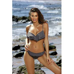 Ten strój obdarzy Cię wyjątkowym wdziękiem (i do tego pozwoli zapomnieć o ewentualnych kompleksach). Ma świetny fason. Został stworzony na małe i średnie biusty - dobrze zbiera, modeluje i unosi piersi, znacząco je powiększając. Dekolt nabiera gracji, seksapealu, a Ty maksimum kobiecości. Jego sekret? - to miseczki usztywniane delikatną pianką, z fiszbinami i dość dużym wypełnieniem push up, które tym razem umieszczono na stałe wewnątrz biustonosza. Falbana na dekolcie to jeden z najbardziej topowych trendów lata. Ramiączka o regulowanej długości, obwód wiązany na plecach. Do tego zalotne figi, typu biodrówki, również z falbaną. Kostium uszyto z pięknej, włoskiej tkaniny Carvico Fabrics, a dostępny jest w wielu atrakcyjnych, plażowych kolorach. Wybierz go w swoim ulubionym!