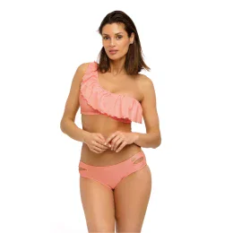 Zaujímavé plavky v jednom z najmódnejších štýlov súčasnosti – latinskoamerických. Dvojdielne a hladké. Súčasťou sady je podprsenka zaväzovaná na chrbte, ktorá imituje top na jedno ramienko. Výstrih s veľkým, vzdušným volánom z ľahkej talianskej látky vyzerá fenomenálne. Krásne prázdninové farby. Podprsenka je bez kostíc, s tvarovanými, skrytými vložkami na tvarovanie pŕs a vystužením na vnútornej strane, vďaka ktorým prsia vyzerajú príťažlivo. Vložky je možné z modelu vybrať, čím vznikne "mäkká" verzia podprsenky. Nohavičky majú veľmi dobrú výšku, sú veľmi pohodlné a po stranách ich zdobia zvodné praskliny.