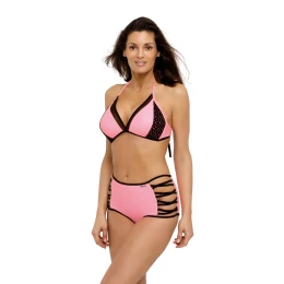 Jedny z najlepších plaviek z kolekcie Leto 2019! Krásne farby, módny strih, vysoký spodný diel a push-up podprsenka. Objednajte si ju a naplánujte si dokonalú dovolenku! Podprsenka sa pohodlne zaväzuje za krkom a na chrbte, má vystužené košíčky, ktoré sú obohatené o push-up, vďaka čomu sú prsia dokonale zhrnuté, pozdvihnuté a zväčšené (push-up výplň je prítomná v každej veľkosti plaviek a nie je z modelu vyberateľná). Dekolt je vyrobený z hladkého čierneho tylu. Na košíčkoch je vsadka z látky imitujúca zmyselnú čipku. Nohavičky sú naozajstným hitom - sú vyššie, a preto veľmi pohodlné, zakrývajú aj bruško a vďaka opaskom-gumičkám na bokoch vyzerajú stále žensky a zvodne. Talianska tkanina, krásne farby na výber. Nechajte sa zlákať, pretože to stojí za to.