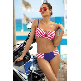 Staňte se trendsetterkou! Vyberte si plavky, ve kterých budete právě vy udávat plážové trendy. Zde je návrh pro odvážné ženy - sexy dvoudílné plavky se smyslnými, námořnickými proužky doplněné (odepínatelnou) broží. Podprsenka je profesionálně modelovaná s vyztuženými košíčky s kosticemi a (vyjímatelnými) push up košíčky, které jsou umístěné ve spodní části košíčků a prsa pozvednou, přiblíží a zvětší o celou velikost. Zaručují tvarovaný vzhled. Push up výplň je k dispozici ve velikostech S, M, L, XL. Ramínka jsou nastavitelná, s možností úplného odepnutí (můžete si rovnoměrně opálit tělo). Podprsenka se zavazuje na zádech. Kalhotky klasického střihu, pěkně zdůrazňují linii boků a jsou velmi pohodlné.
