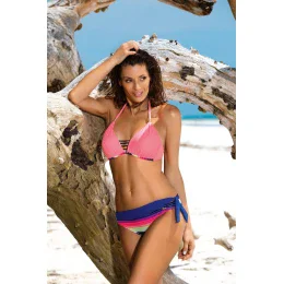 Biustonosz z trójkątnymi miseczkami usztywnianymi specjalną pianką, wzbogacony push-up-em - dzięki niemu piersi uniosą się i optycznie powiększą, tworząc zmysłowy, głęboki dekolt. Push-up umieszczony jest w kostiumie na stałe i nie jest wyjmowany z modelu, występuje w każdym rozmiarze kostiumu. Biustonosz zwraca także uwagę modnym dodatkiem w postaci "pasków-gumek" umieszczonych przy dekolcie. Ładne ramiączka wiązane na szyi, zdobione delikatną, biżuteryjną ozdobą (można ją zdjąć), będą atrakcyjnie prezentować się w promieniach słońca. Majteczki o doskonałym kroju "midi" - o wyśrodkowanej wysokości. Są wzorzyste i ozdobnie wiązane na boku (klasyczny, wkładany krój). Skład: 80% poliamid, 20% elastan.