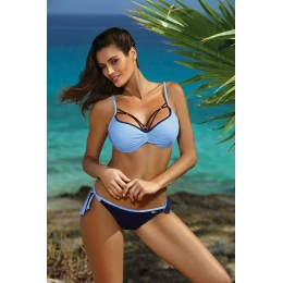 Biustonosz o usztywnianych miseczkach, z fiszbinami i wypełnieniem push up, wbudowanym na stałe do modelu. Świetnie unosi piersi, modeluje je i kusząco powiększa, co zresztą widać na zdjęciu. Strapsy (paski-gumki) są elastyczne, z biżuterią w złotym kolorze i mega modne. Dodają prawdziwego seksapealu, na który śmiało można sobie pozwolić na plaży. Ramiączka o regulowanej długości, nieodpinane. Obwód elastyczny, wiązany na plecach. Figi typu brazylijskiego, wysoko wycięte na pośladkach - seksowne i idealne do opalania. Aby uzyskać pełen, brazylijski efekt figi należy znacząco pociągnąć ku górze bioder. Po bokach wygodne wiązania. Ps. Figi z tyłu mają dodatkowe marszczenie na tkaninie, które optycznie zmysłowo zaokrągla pupę.