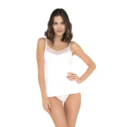 Elegantná hladká blúzka s krásnym krajkovým zdobením pozdĺž výstrihu. Základný model s tenkými, nastaviteľnými ramienkami je ideálny pre širokú škálu outfitov. Zloženie: 100% bavlna.