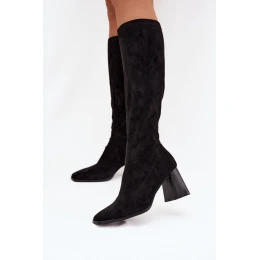 Stylowe kozaki damskie wykonane z miękkiego eko zamszu. Stabilny obcas w formie słupka zapewnia komfort noszenia, a delikatnie zaokrąglone noski dodają całości subtelnego charakteru. Model wsuwany, z dodatkowym suwakiem na dole. Przylegająca cholewka ozdobiona przeszyciami pięknie podkreśla linię nóg, tworząc smukłą i kobiecą sylwetkę. Ocieplane kocem obuwniczym wyłącznie na wysokości stopy. Doskonałe zarówno do codziennych, jak i eleganckich stylizacji na chłodniejsze dni. Przy wyborze rozmiaru prosimy sugerować się tabelą rozmiarów.