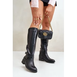 Kozaki Damskie Przed Kolano Na Płaskim Obcasie Z Klamrami Czarne Lotina