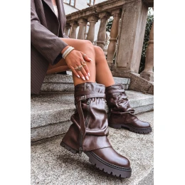 Kozaki Damskie Z Wywiniętą Cholewką Do Połowy Łydki Z Paskiem Czekoladowe Darisa