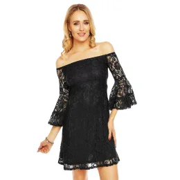 Čipkované dámske šaty s lodičkovým výstrihom a širokými rukávmi čierne - Čierna - MAYAADI