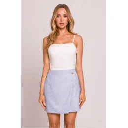Elegantná minisukňa v tvare lichobežníka vyrobená z vysokokvalitnej tkaniny. Asymetrický strih s ozdobným motívom na prekrývaní dodáva sukni osobitý charakter, zlatý gombík v tvare srdca jemne podčiarkuje elegantný akcent. Model má na boku skrytý zips, ktorý zabezpečuje pohodlné nosenie a ideálne prispôsobenie. Sukňa je celá podšitá, čo zvyšuje pohodlie a vďaka tomu dokonale sedí. Navrhnutá a ušitá v Poľsku s dôrazom na každý detail.
