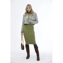 Sako má klopy a zapína sa gombíkom. Ramená sú vystužené vypchávkami. Model má dĺžku do pása a má podšívku.