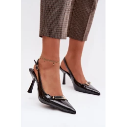 Elegantní dámské sandály vyrobené z lakované eko kůže jsou vhodné pro ženy, které chtějí zdůraznit výjimečný charakter svého stylu. Tenký podpatek typu jehla dodává siluetě lehkost a eleganci, nastavitelné pásky s přezkou umožňují dokonale přizpůsobit boty noze. Přední část zdobí jemný pásek se zlatou přezkou, který je stylovým akcentem. Špičatý nos opticky prodlužuje nohy a dodává celkovému vzhledu eleganci. Tento model je ideální na večerní výlety, slavnostní příležitosti a elegantní setkání. Při výběru velikosti se řiďte tabulkou velikostí.