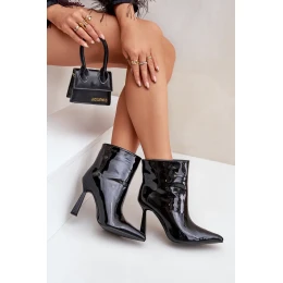 Dámske členkové topánky z lakovanej kože na vysokom podpätku. Model so špicatou špičkou, ktorý opticky zoštíhľuje nohu. Zateplené s podšívkou, ideálne na chladnejšie dni. Ideálne na štylizáciu na špeciálne príležitosti. Pri výbere veľkosti sa riaďte tabuľkou veľkostí.