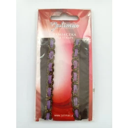 Čierne textilné popruhy s ozdobným zlatým a fialovým pruhom.