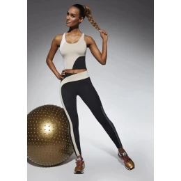 Športové legíny z materiálu PLUSH-ZERO (PZ) ARCHROMA. Tento materiál má funkčné vlastnosti, a preto je označovaný ako úchvatný, vďaka svojej špeciálnej úprave štruktúry chemických vlákien má ARCHROMA výrazne zlepšené vlastnosti prúdenia vzduchu a odstraňovanie vlhkosti. Športové legíny s asymetrickým, všitým, béžovým pruhom krásne podtrhuje postavu.