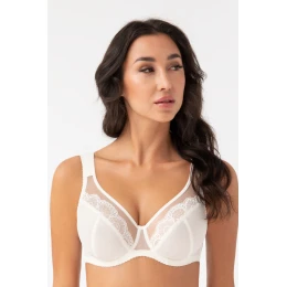 Táto podprsenka v ecru farbe má klasický priliehavý strih. Košíčky sú mäkké a hladké, mierne priehľadné, vyrobené z jemného materiálu a v hornej časti zdobené jemnou kvetinovou čipkou. V strede a vo výstrihu sú tylové vsadky, ktoré dodávajú ľahkosť a zvýrazňujú líniu poprsia. Široké, pohodlné ramienka zabezpečujú stabilnú oporu a pohodlie pri nosení. Neutrálny podklad je zvýraznený ušľachtilým ecru odtieňom a detailmi dizajnu, ktoré celku dodávajú svieži, elegantný vzhľad.
