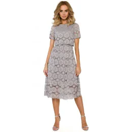 Vrchná časť: 92 % nylon 8 % elastan Spodná časť: 95 % polyester 5 % elastan Tieto elegantné šaty ponúkajú pôvabnú siluetu, navrhnutú s celoplošnou čipkou. Kvetinový vzor dodáva romantický nádych, zatiaľ čo dĺžka do polovice lýtok zaručuje štýlový vzhľad. Skrátený vrchný diel a šaty v midi dĺžke majú pod sebou tkanú podšívku. DETAILY VÝROBKU: vnútri tkaná látka, zvonka čipka, obe vrstvy spojené fit and flare strih čipkované rukávy s dĺžkou pod kolená skryté bočné zapínanie na zips Naša modelka je vysoká 171 cm a nosí veľkosť S