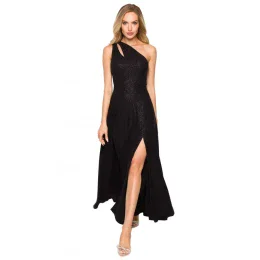 95 % polyester 5 % elastan Elegantné a šik. Tieto šaty spestria každú príležitosť. Dlhý rozšírený strih s vysokým rozdelením nôh a priliehavým topom na jedno rameno so sexi výrezom. INFORMÁCIE O VÝROBKU: Úplet s trblietkami Šaty v maxi dĺžke s detailom na jedno rameno Priliehavý top s rozdelením ramien Skrytý bočný zips Rozšírená maxi sukňa s vysokým rozdelením nôh bez podšívky Naša modelka meria 171 cm a nosí veľkosť S