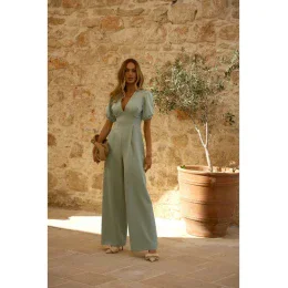95% polyester 5% elastan INFORMÁCIE O PRODUKTE: tkaná látka jednodielny overal hlboký výstrih do V a v páse krátky rukáv manžety široké nohy so záhybmi v páse skrytý zadný zips čiastočne podšitý Naša modelka je vysoká 171 cm a nosí veľkosť S navrhnuté a vyrobené v Poľsku