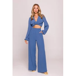 95% polyester 5% elastan MATERIÁL Materiál: ľahká štruktúrovaná tkanina (krep), matný povrch PODROBNOSTI O VÝROBKU Pás: vysoký, elastický pás Zapínanie: navliekacie (bez zipsu) Vrecká: žiadne Model: M862 Navrhnuté a vyrobené v Poľsku Model na fotografii má 171 cm a nosí veľkosť S Strih a strih Strih: voľný Strih: široké nohavice Dĺžka: po celej dĺžke