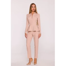 materiál: 95% polyester 5% elastan Tkanina: hladká tkanina s matným povrchem PODROBNOSTI O PRODUKTU Výstřih: výstřih do V s nastavitelnou hloubkou Rukávy: dlouhé Zapínání: vpředu na skrytý zip, vzadu na skrytý zip Pas: vypasovaný, zvýrazněný stylovým peplumem Nohy: zúžené směrem k lemu, délka ke kotníkům Kapsy: žádné Podšívka: žádná Model: M878 Navrženo a vyrobeno v Polsku Modelka na fotografii je vysoká 171 cm a má na sobě velikost S STYL A STŘIH Styl: jednodílný overal, vypasovaný v horní části těla, s peplumem zakrývajícím boky, část hýždí a oblast břicha Tvar: zvýrazňující postavu, s peplumem v pase a zúženými nohavicemi