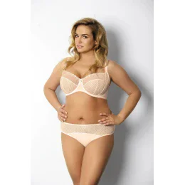 Košíčky podprsenky sú vyrobené z jemnej bodkované čipky a ich hornú líniu tvorí sieťovina, ktorá je ozdobená efektnou výšivkou. Boky sú zosilnené zvislými kosticami. Ramienka tohto modelu nie je možné odopnúť.