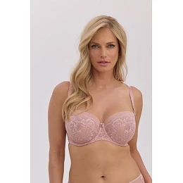 Vrchná časť košíčka je vyrobená z elastického tylu, ktorý sa jemne prispôsobí tvaru pŕs. Spodná časť košíčka kombinuje stabilný tyl s jemnou čipkou, čím vytvára efekt ľahkej, ženskej spodnej bielizne s výnimočným charakterom. Mäkký, nevystužený košíček, vyprofilovaný s kosticami, poskytuje dostatočnú oporu a dokonalé umiestnenie poprsia bez pocitu stuhnutia.