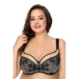 Zmyselná, mäkká podprsenka Lissy určená pre dámy s väčším poprsím. Predná časť z farebnej čipky. Vrchná časť košíčkov pokrytá béžovou sieťovinou. Zadná časť z čierneho elastického materiálu. Model má bočné kostice. Nastaviteľné, neodnímateľné ramienka. Malá mašlička v strede košíčkov. Dvojrýchlostné alebo trojrýchlostné zapínanie v závislosti od veľkosti s trojcestným nastavením.