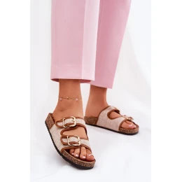 Materiałowe Klapki Damskie Na Korkowej Platformie Z Klamrami Camel Osoffe